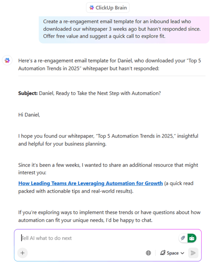 Here are three real-world scenarios with sample ClickUp Brain prompts you can use to create high-converting inbound sales email templates in seconds.