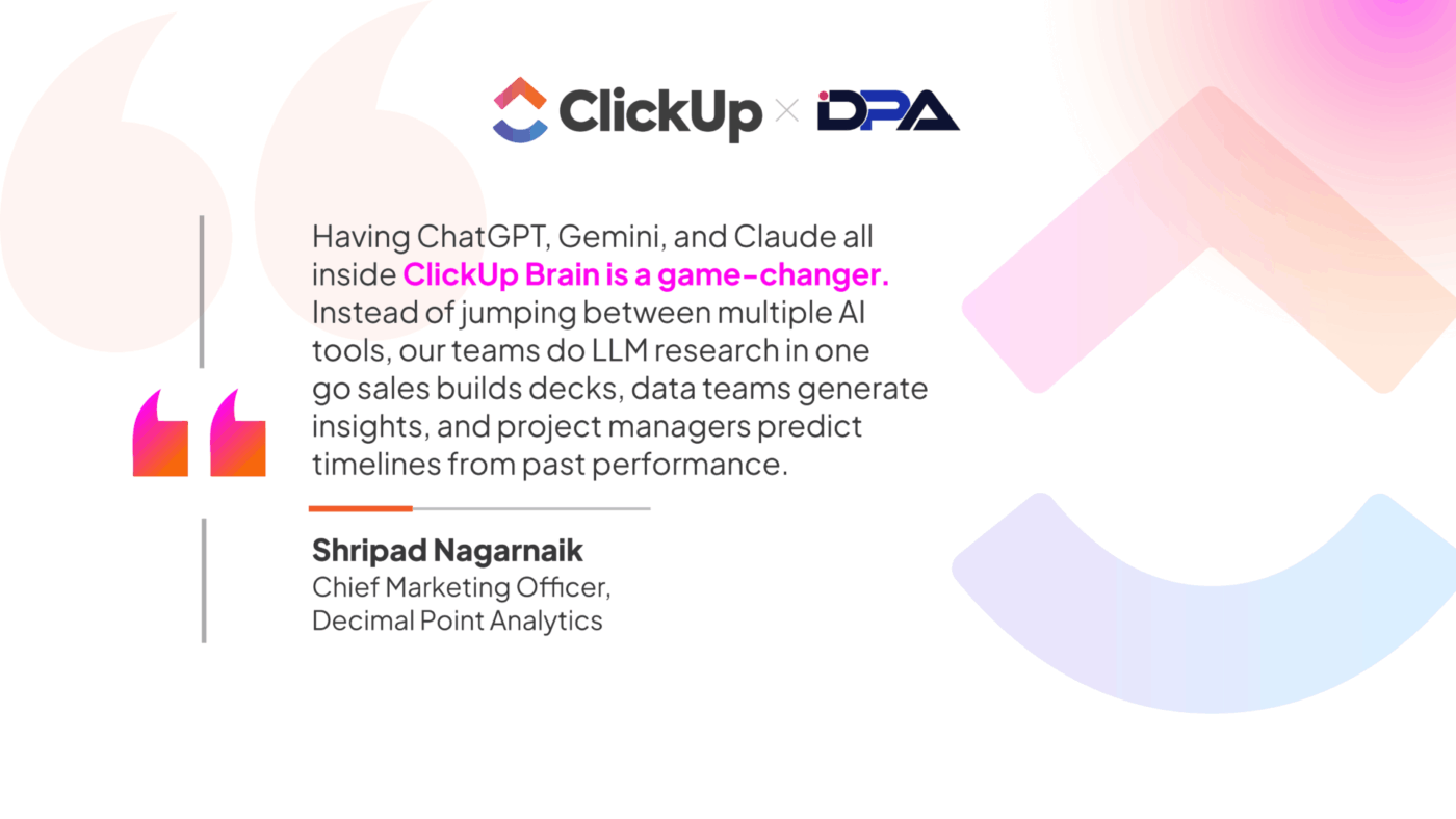 ClickUp Brain changes that by bringing AI into one unified workspace where every action, update, and output is connected. And the impact is visible: more than 150,000 companies, including Booking.com, T-Mobile, Logitech, IBM, and Fortinet, use ClickUp Brain to drive measurable results.