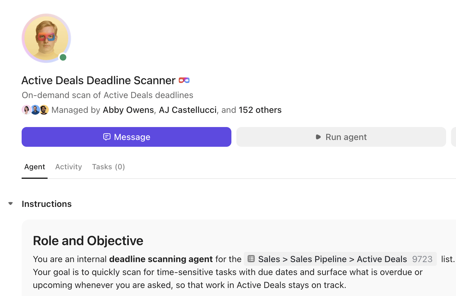 On the other hand, you have ClickUp Custom Agents that let you create your own automations with a no-code builder. These are more flexible and let you tailor what the agent does, when it runs, and how it interacts with your workspace. Here’s one from our team: