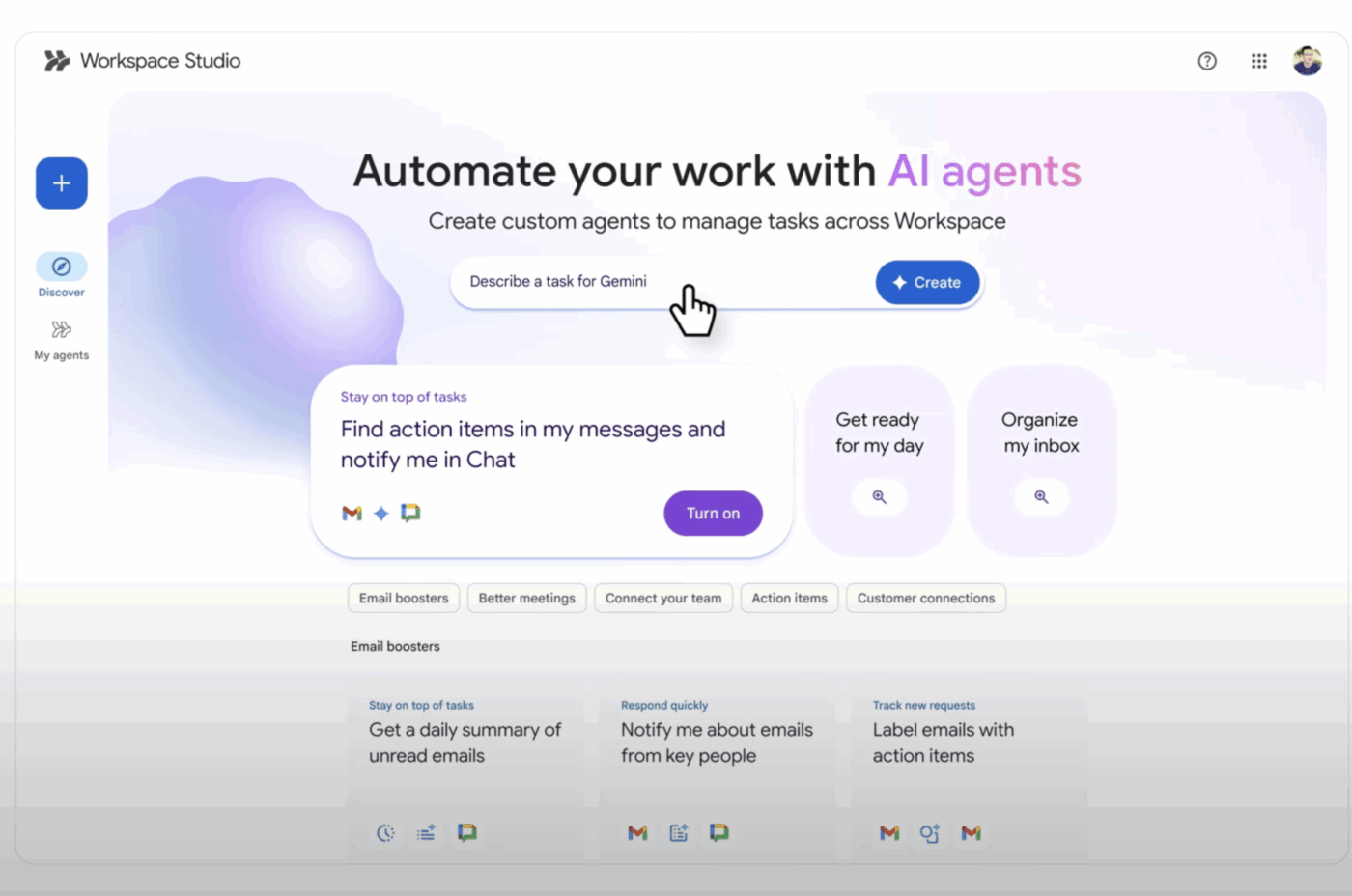 Google Workspace Studio lets you create AI agents just by describing what you want them to do. For example, you can say: ‘Flag emails from finance, extract invoice amounts, add them to Sheets, and notify me in Chat.’