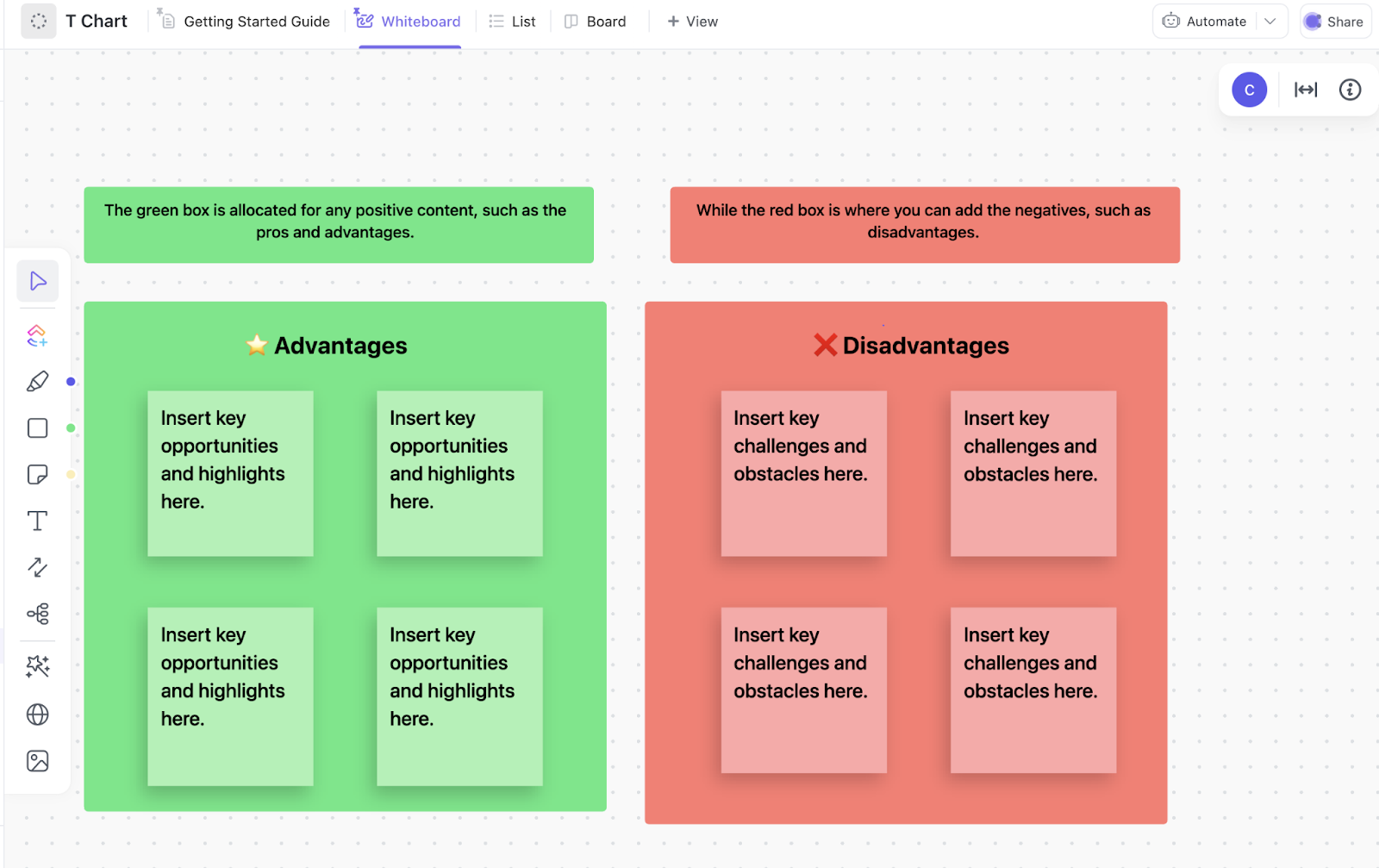 ClickUp T Chart Template is a free graphic organizer template that helps you visually compare two options side by side. Such as analyzing pros and cons, similarities and differences, or key details