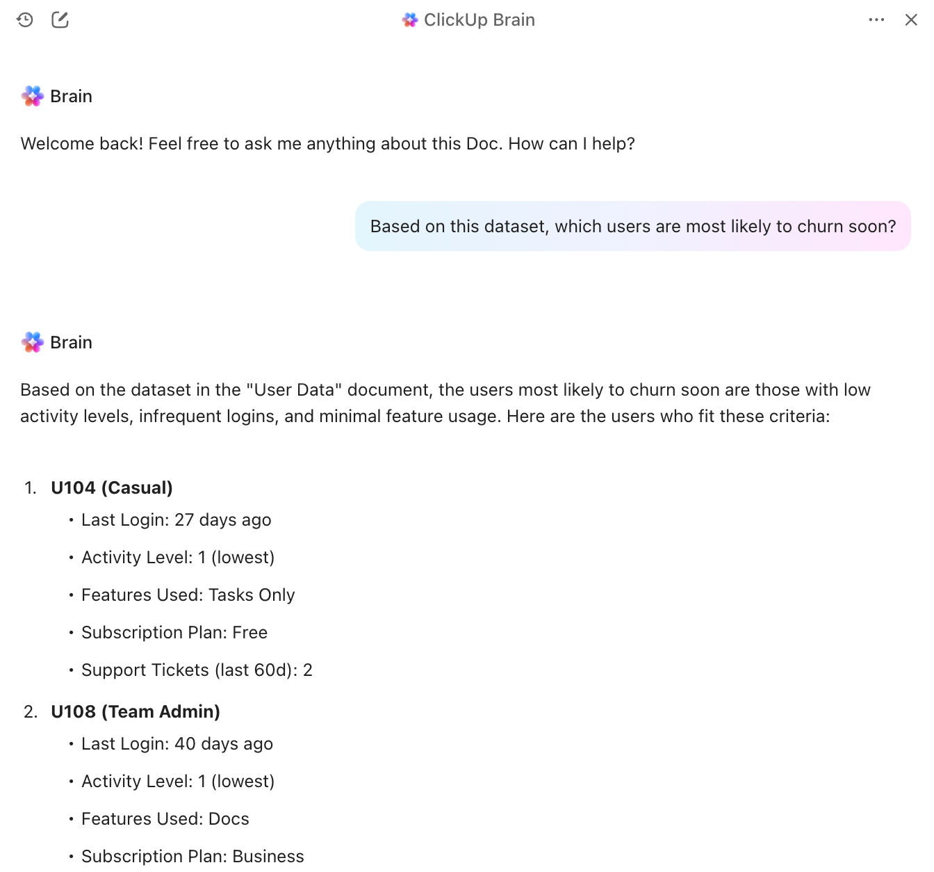Then ask ClickUp Brain to summarize the top pain points, group them by persona or segment, and pull a few representative quotes for each theme.