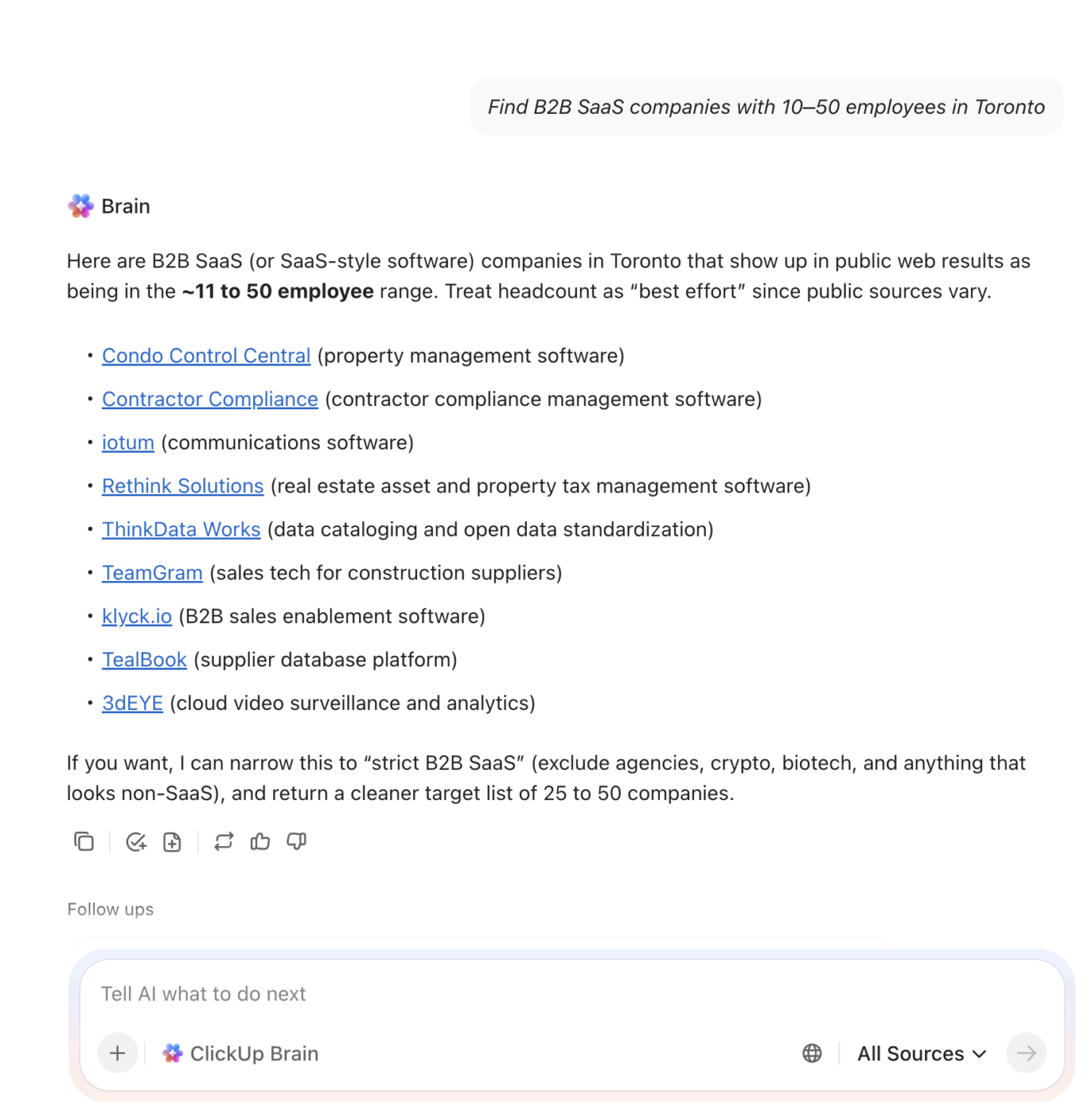 📌 Example: Need a list of local SaaS companies to pitch a project management tool? Ask Brain to “Find B2B SaaS companies with 10–50 employees in Toronto.” In minutes, you’ll get the information you need.