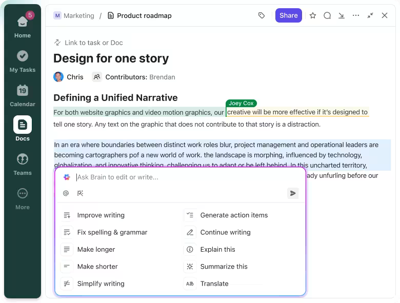 Writers, editors, and marketers can all collaborate in the same thread—so feedback, versions, and final approvals stay centralized instead of scattered across docs and emails. Plus, ClickUp Brain is always at hand to answer questions, so you needn’t trawl through lengthy comment threads!