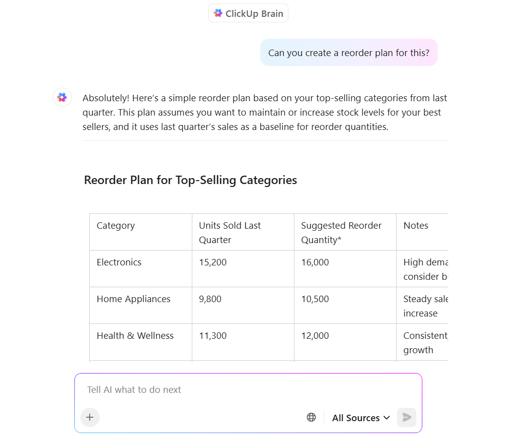 Ask ClickUp Brain for recommendations based on your actual sales patterns.