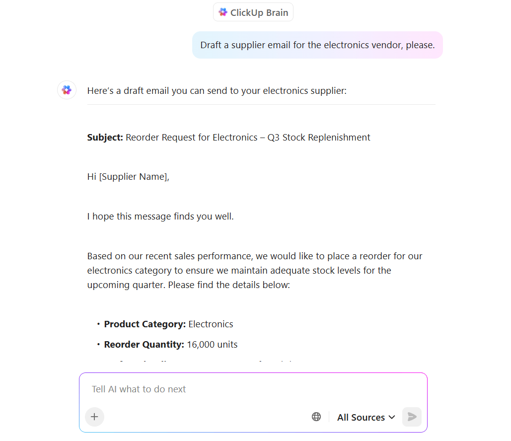 Then, when you need to draft a supplier email, ClickUp Brain can pull up your last three orders with that vendor, copy the relevant details, and write a professional message in seconds.