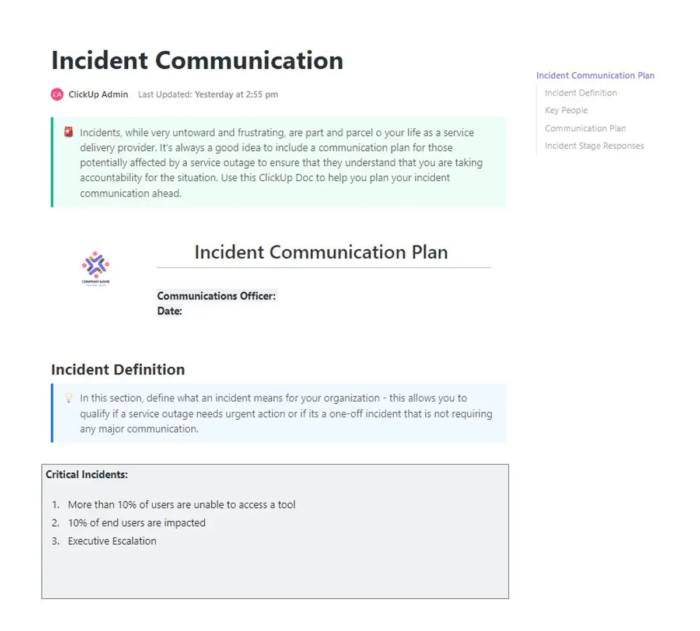 ⚡ Template Archive: When incidents hit, the biggest risk often is the confusion that follows. Delayed updates, unclear ownership, and scattered communication can slow response times and amplify impact. That’s exactly where the ClickUp Incident Communication Plan Template delivers real value.