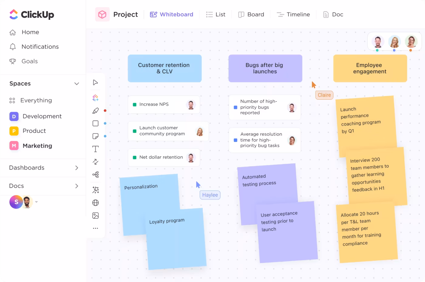 - Visualize the feedback loop as a team → Collect (ClickUp Forms) → Analyze ( ClickUp Brain, ClickUp Dashboards) → Act (Tasks, Goals) → Improve (Docs, Whiteboards)