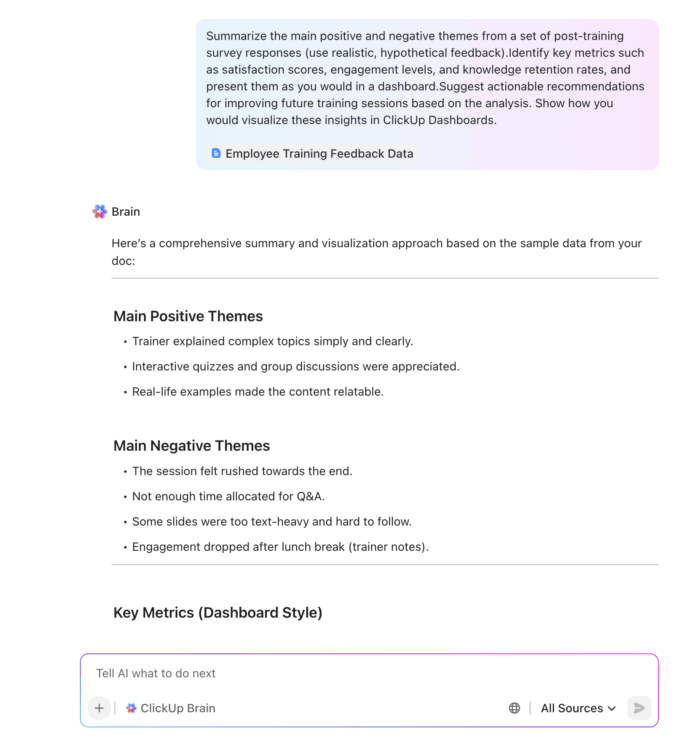 Data only matters if you can act on it. The key is pairing numbers with narrative: satisfaction scores, retention metrics, and engagement levels on one side, employee comments on the other. ClickUp Dashboards and ClickUp Brain connect these signals so insights don’t get lost in spreadsheets.