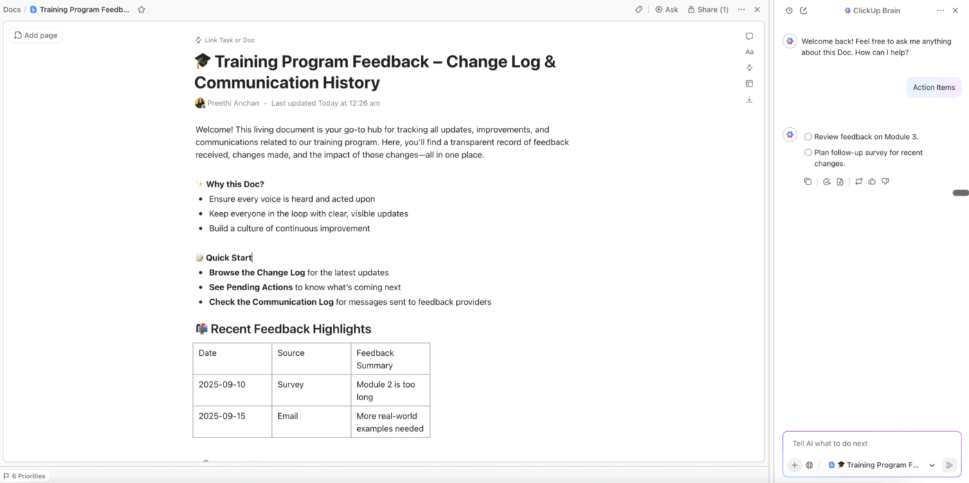 In ClickUp: Capture debrief notes in ClickUp Docs and connect them directly to the training program task. Later, let ClickUp Brain summarize recurring themes and spin out as follow-ups on ClickUp Tasks.