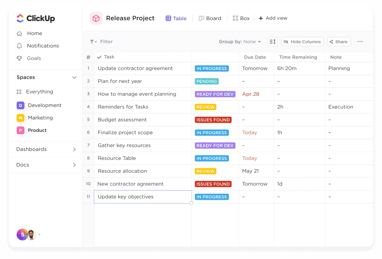 Document management is just one piece of the puzzle. Apart from that, you need to give shape and structure to rough data as they arrive. This is when you can use ClickUp Table View to visualize data through a condensed view of large datasets.