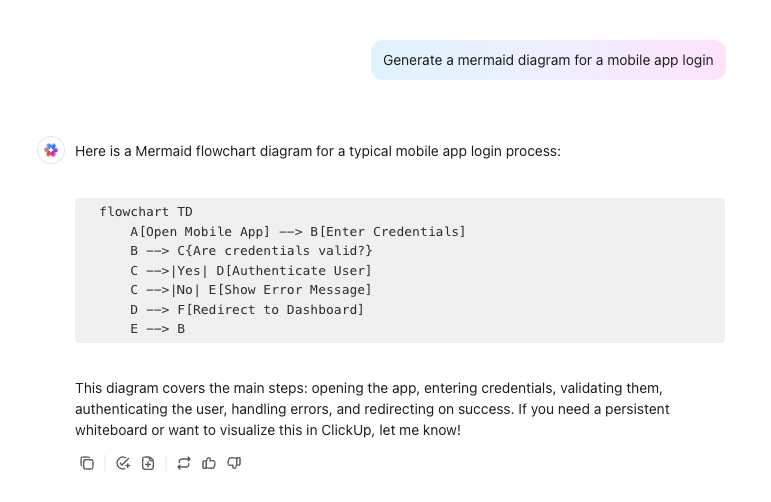 Meanwhile, your developers can use the same space to generate sequence diagrams, request code snippets, or document backend architecture, without leaving ClickUp.