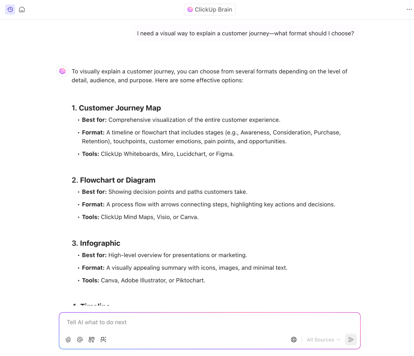 And if you are stuck choosing the format, you can ask ClickUp Brain for help. It’s an AI-powered assistant built into ClickUp that helps you think clearly, plan faster, and avoid decision fatigue.