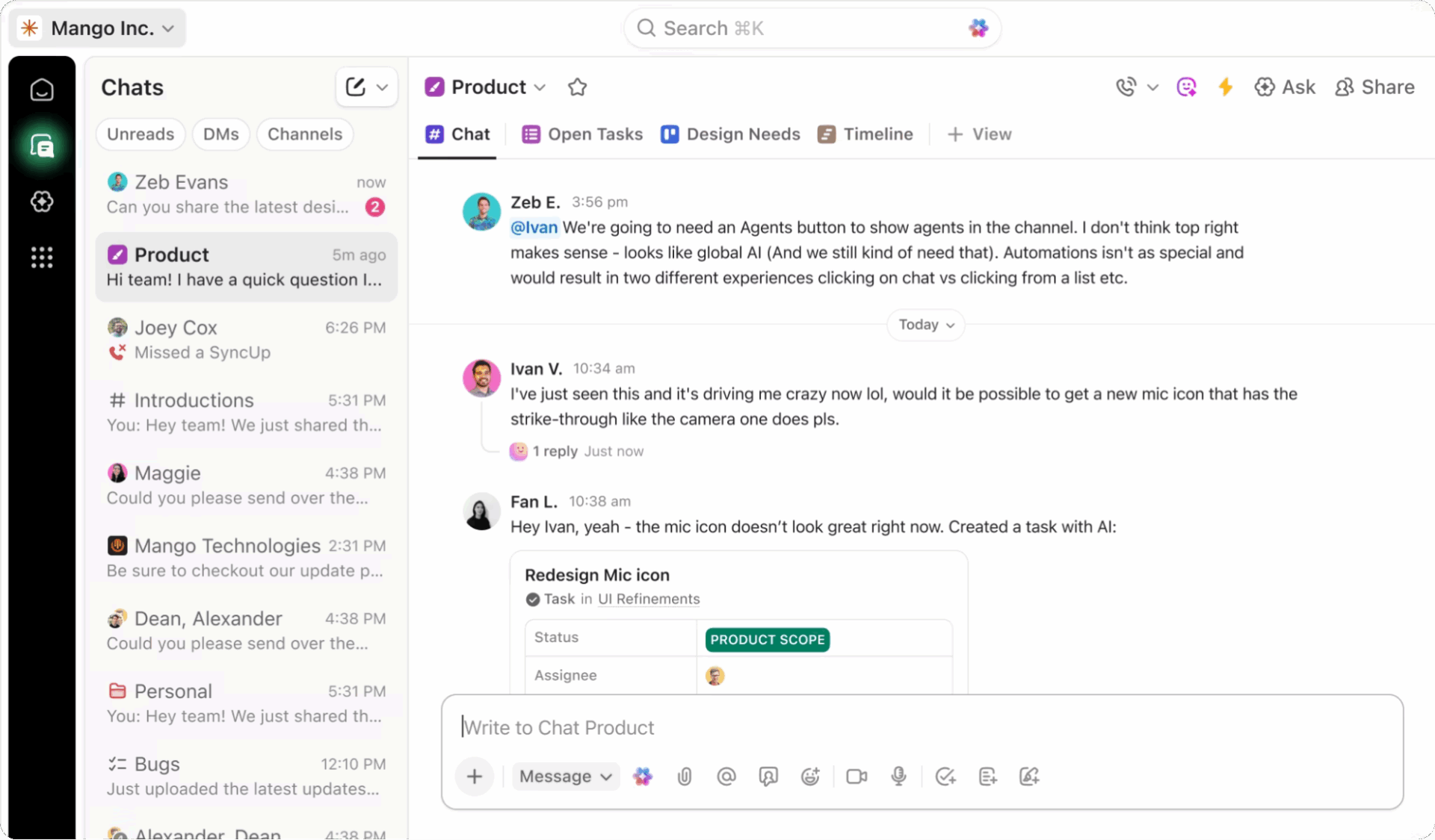 ClickUp’s Chat facilitates communication throughout the feasibility study. Use comments to discuss specific aspects of the research within relevant documents or tasks. Utilize the feature for real-time discussions and quick updates.