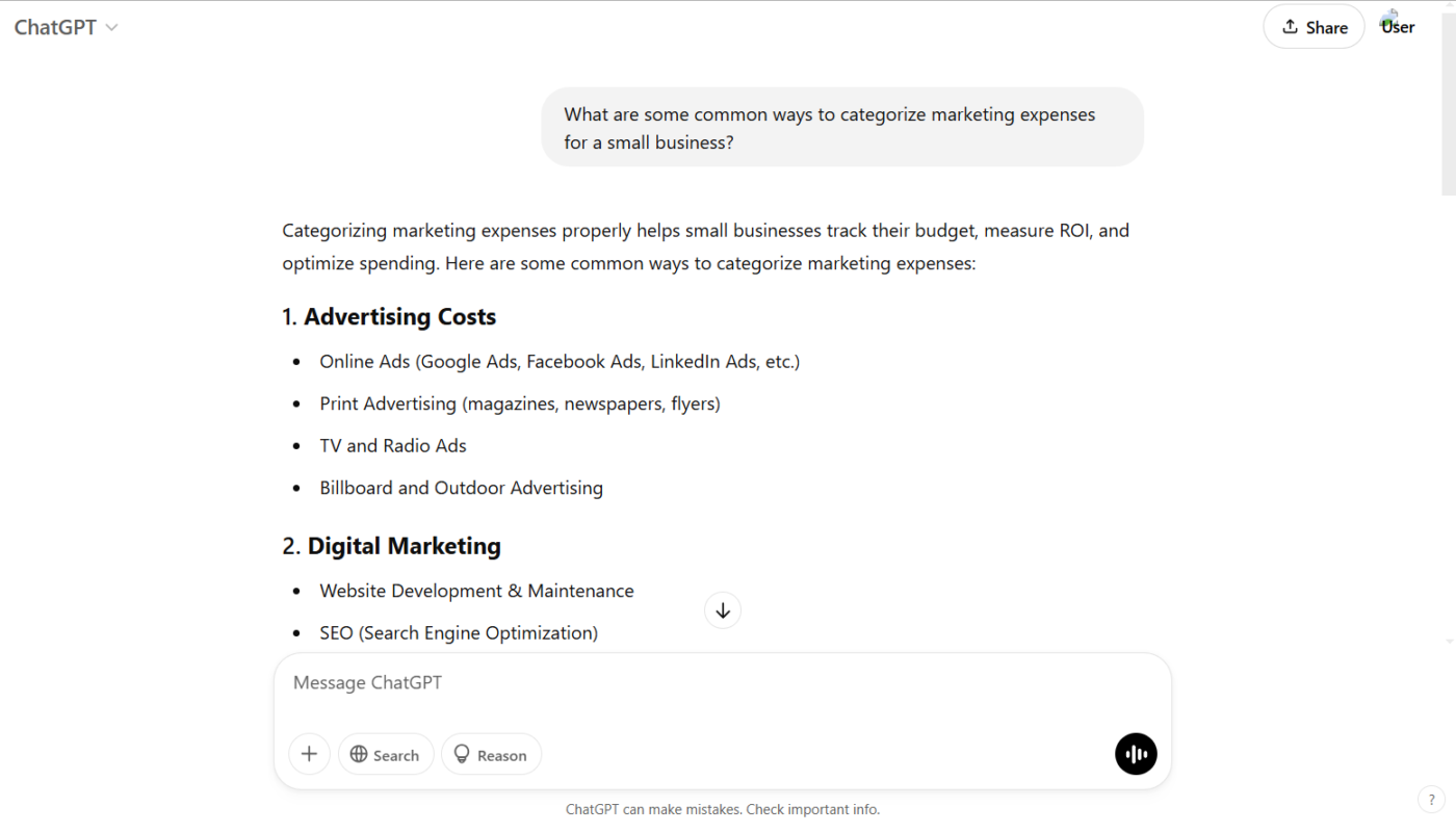 Prompt: What are some common ways to categorize marketing expenses for a small business?