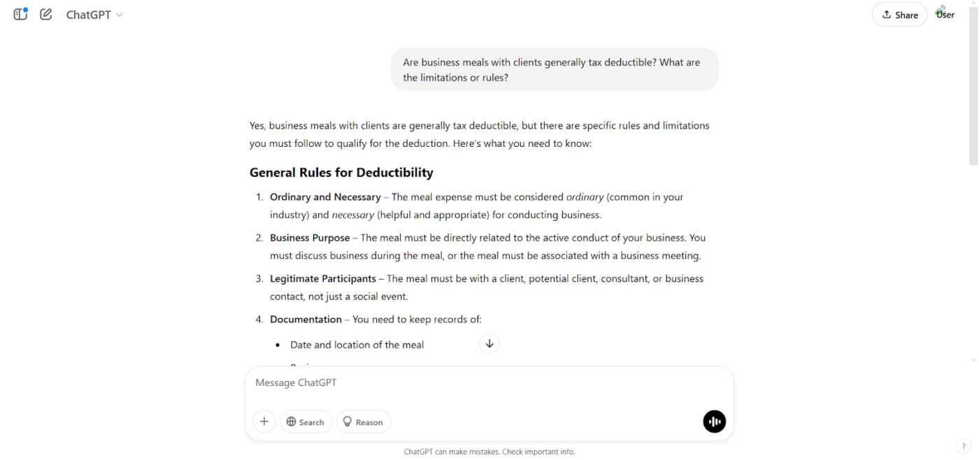 Prompt: Are business meals with clients generally tax-deductible? What are the limitations or rules?