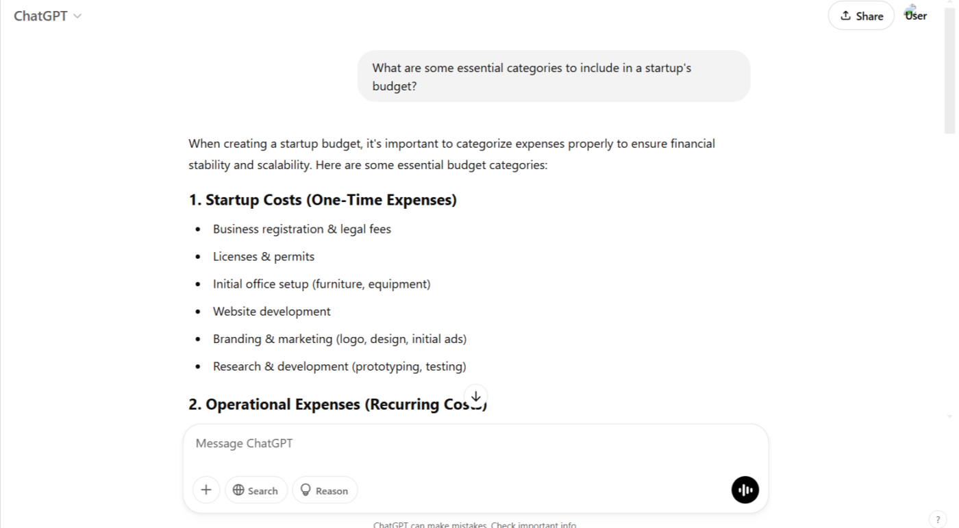 You’re starting a new business and need a basic budget. ChatGPT will give you a list of common categories (like rent, utilities, marketing, and salaries), which you can then customize with your specific numbers.