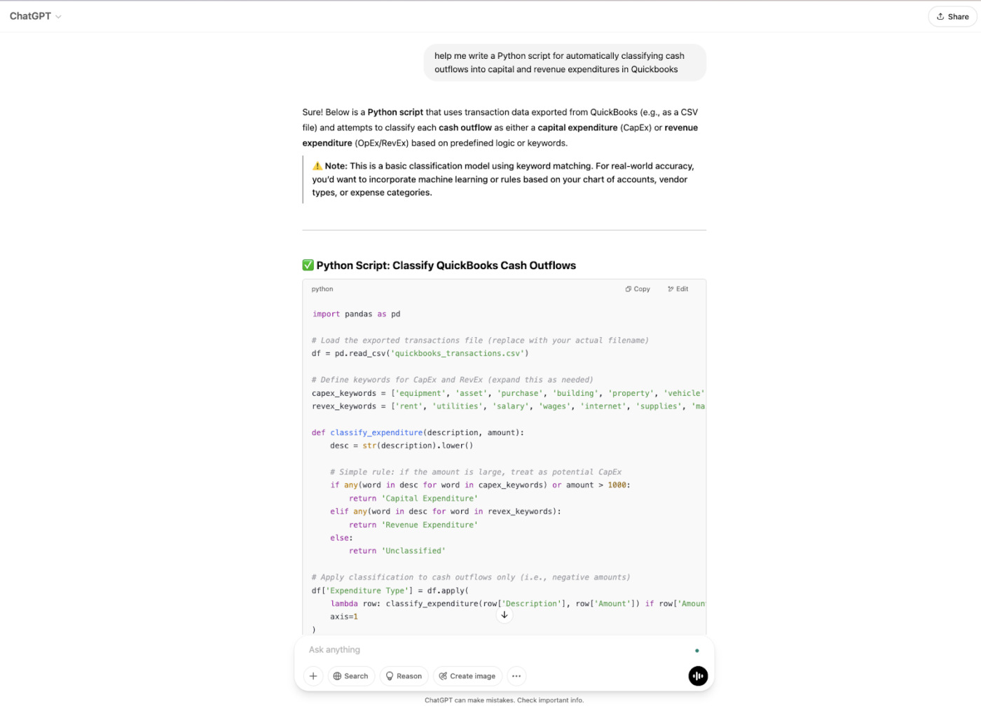 ChatGPT can help write scripts for Excel, Python, or other programming languages if you ever need to automate accounting tasks with coding.