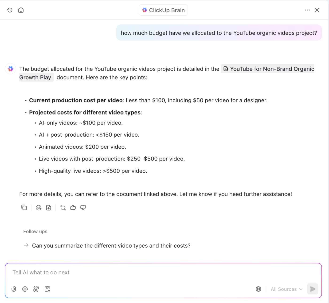 Instead of digging through spreadsheets or financial reports, ClickUp Brain can instantly surface key financial data, like expense summaries or outstanding invoices. It also pulls numbers from reports, balance sheets, and transaction logs to speed up financial reviews.