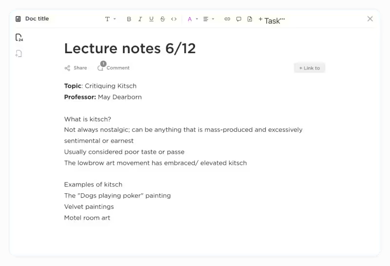 When Claude helps you synthesize research or develop arguments, save those insights directly to ClickUp Docs where they connect to your actual assignments. Unlike scattered chat logs, Docs let you organize, tag, and search your notes across all courses. You can link specific insights to tasks, ensuring nothing gets lost between the brainstorming phase and the final assignment.