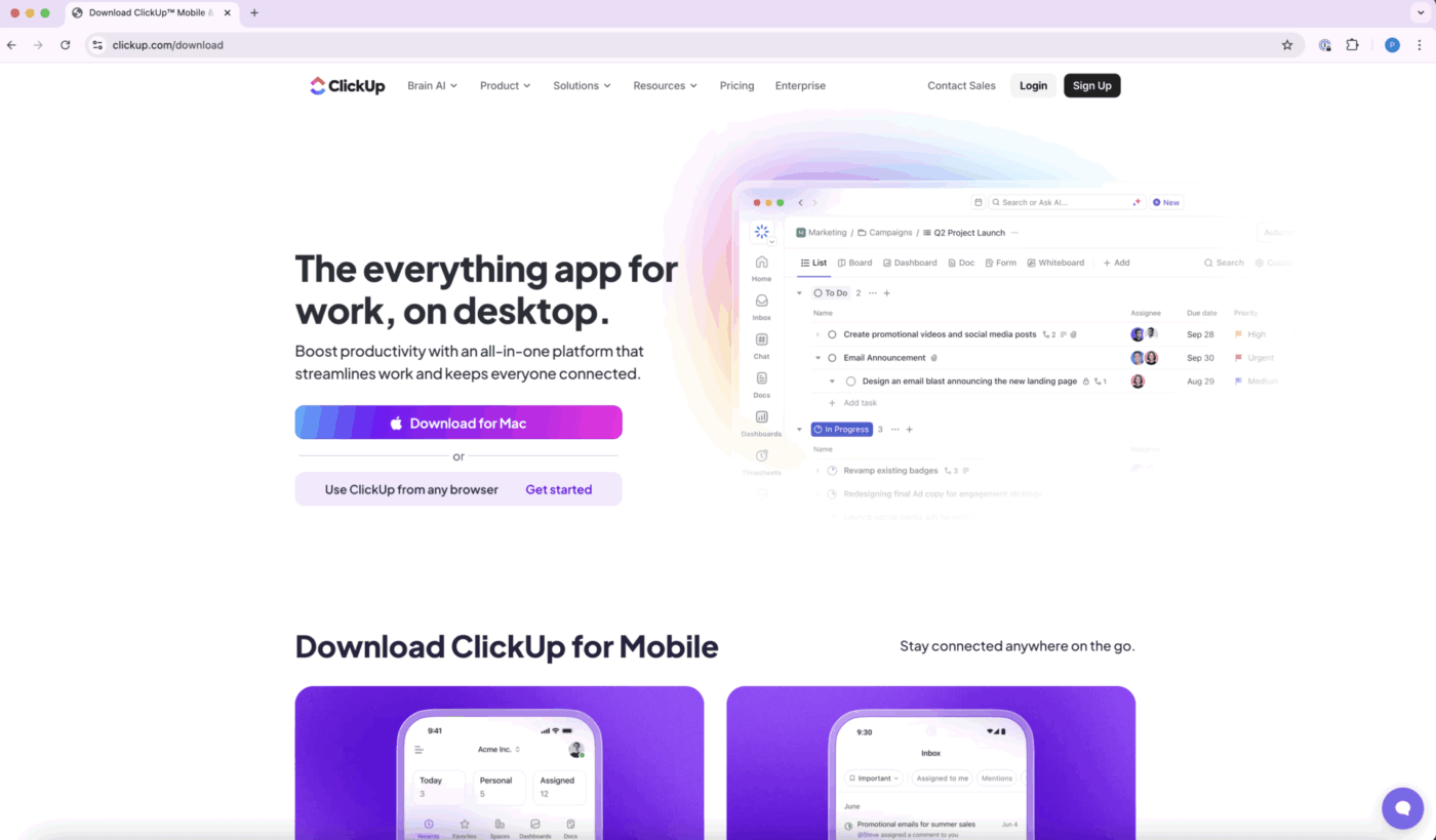 You can install the ClickUp desktop app directly from the ClickUp website or, for some platforms, from app stores.