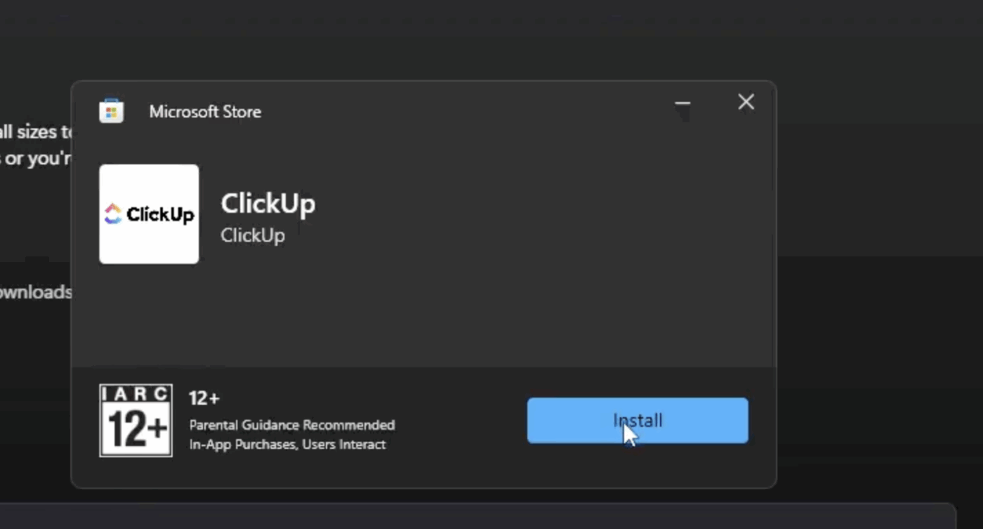Open the downloaded ClickUp Installer (.exe) file. If prompted, click “Install” in the Microsoft Store pop-up.