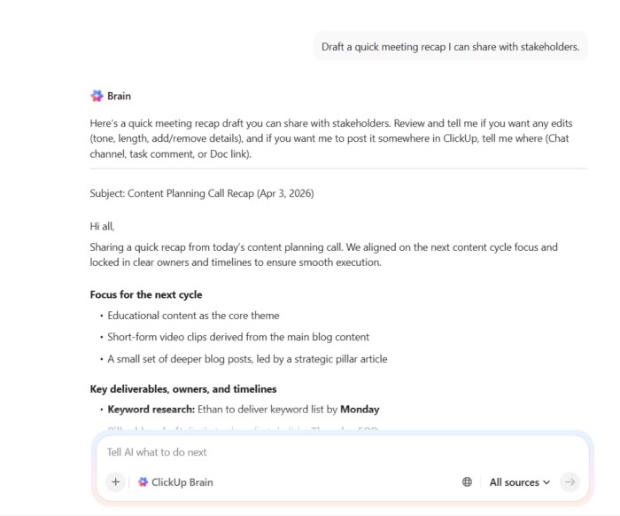From that same call, ClickUp Brain highlights:
