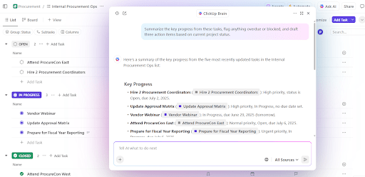 You don’t have to manually dig through weeks of training data to get a summary of experiments so far. Just mention @Brain on any task comment, and ClickUp Brain will give you the help you need with full context to your past and ongoing projects.