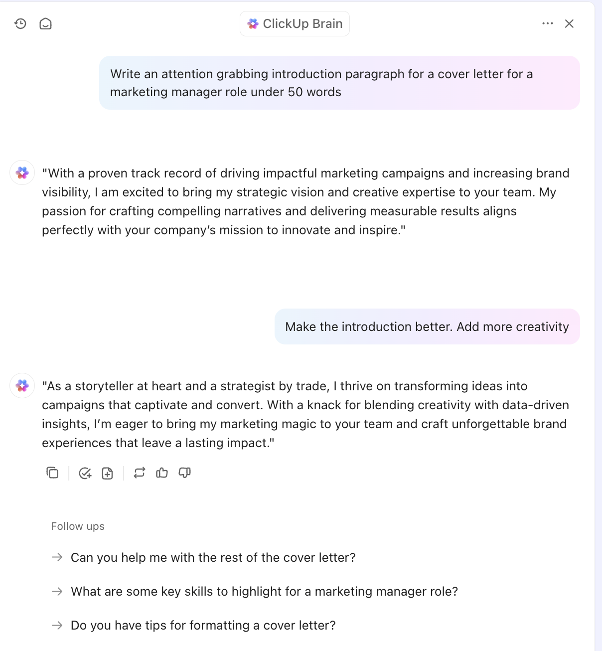 Struggling to find the right words? ClickUp Brain makes writing and refining your resume and cover letter effortless. Whether you need help drafting a strong introduction, polishing your wording, or making your content more engaging, ClickUp has you covered. With ClickUp Brain, you can