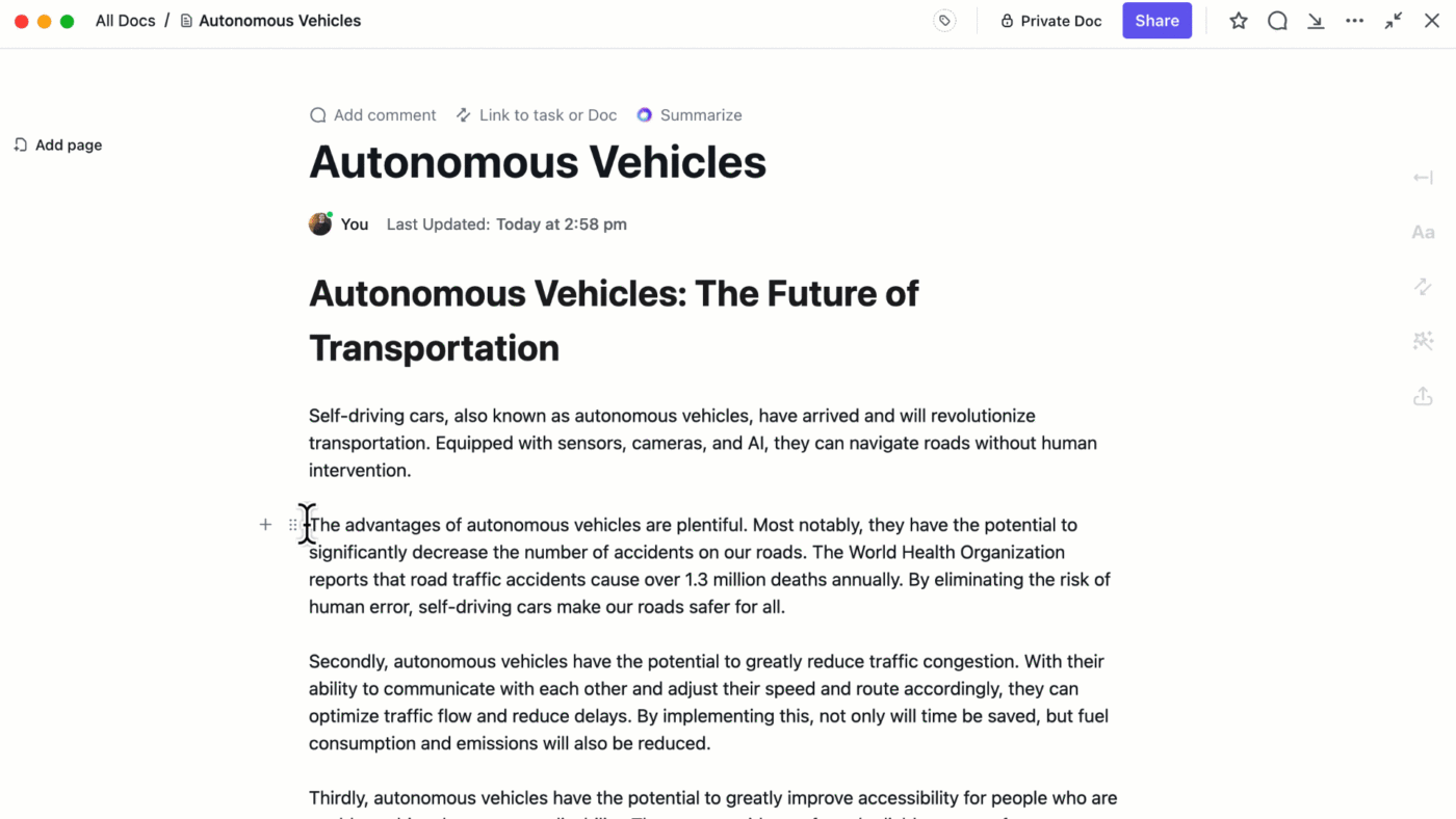 Using ClickUp Docs to draft your contract lets you collaborate with your client and sales team in real-time. Tag team members to verify details or update information, ensuring everything is accurate.