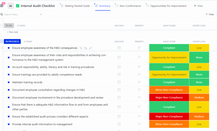 Behind the scenes, the template adds custom statuses for each audit step, views for “Summary,” “Nonconformance,” and “Opportunities for Improvement,” and Custom Fields for audit score, effort level, evidence, and root cause. That means you are able to document how to fix common issues and who owns each follow-up.