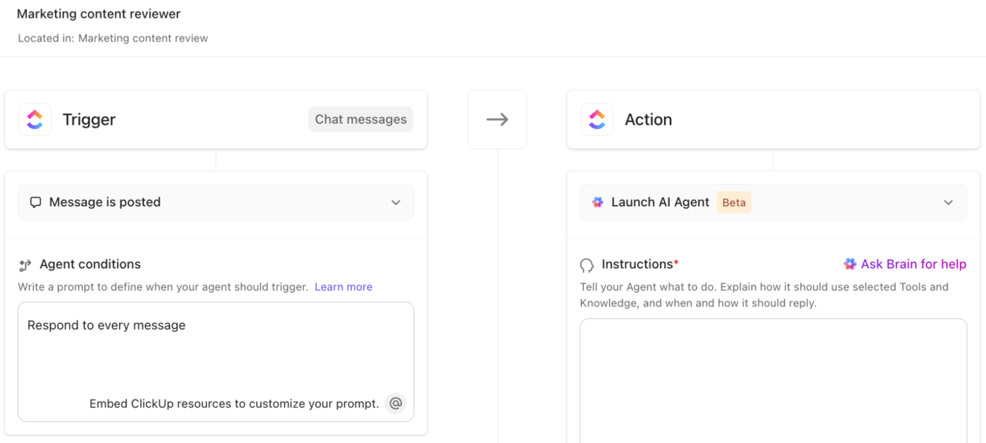🦄 ClickUp Hack: ClickUp’s Live Intelligence Agents require zero coding knowledge to build. You can build and deploy agents directly from the no-code Agents Builder, using a visual interface that lets you: