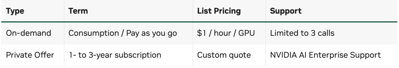 This hourly rate provides access to the full Nvidia AI Enterprise stack in the cloud, with enterprise support included when contracted via cloud providers.
