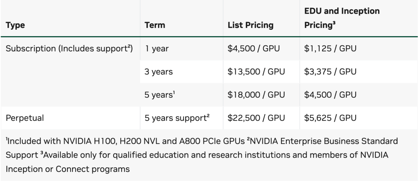 Multi-year subscriptions are available at $13,500 per GPU for three years, and a perpetual license runs $22,500 per GPU with five years of support. Education and startup programs can receive discounts up to 75 percent.