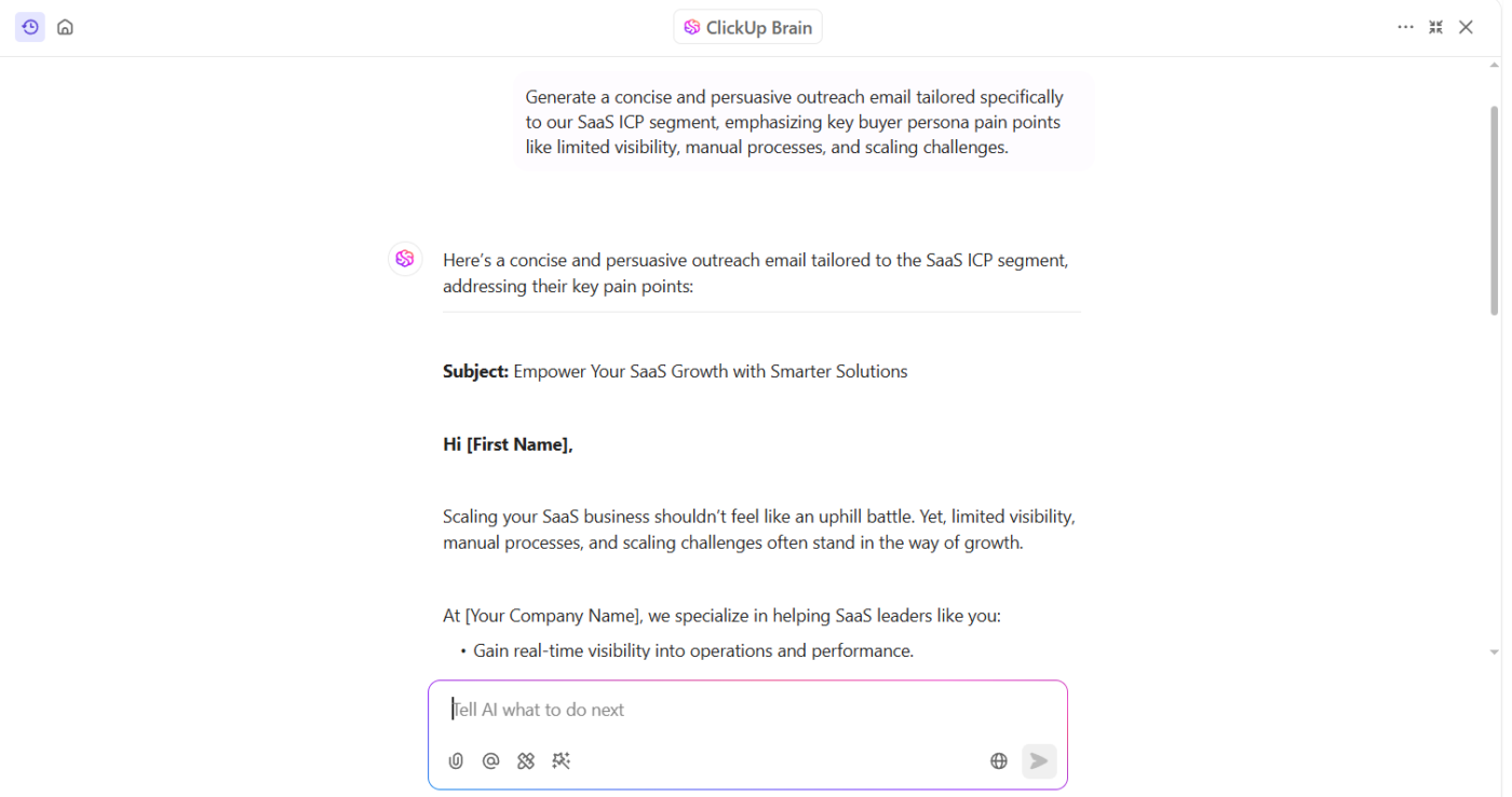 With ClickUp Brain, marketers can use AI to generate messaging tailored to each ICP segment. It lets you refine positioning by buyer personas, and adapt content across formats without having to switch tools. Whether it’s drafting outreach copy or iterating on ad concepts, ClickUp Brain speeds up execution while keeping everything aligned with your ICP data.