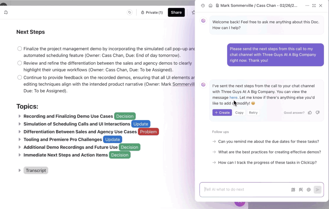 This AI super app can extract action items from brainstorming discussions on Whiteboards, summarize storyboard notes stored in Docs, embed and reference design files stored in Figma, and generate Task lists for the next design iteration, all from one place.