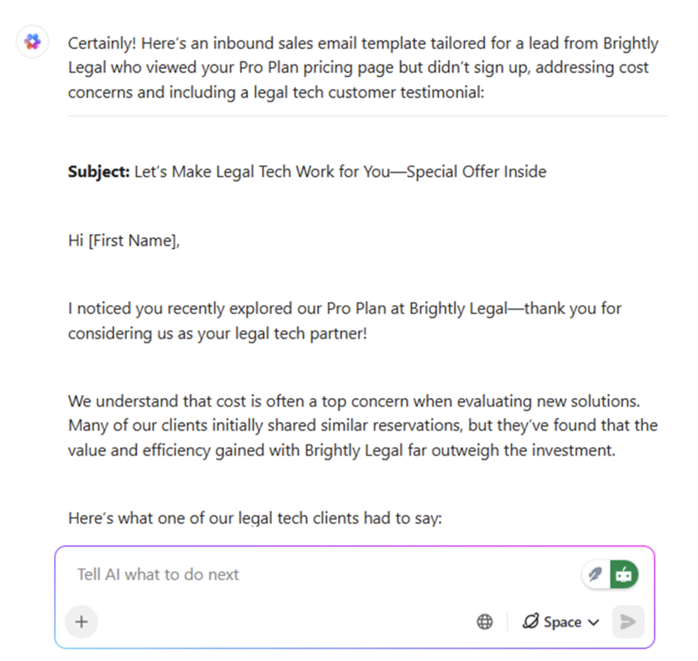 ClickUp Brain, a contextual AI, understands your outreach system as it resides within ClickUp. It has context from your Lists, tasks, Docs, CRM fields, and notes.