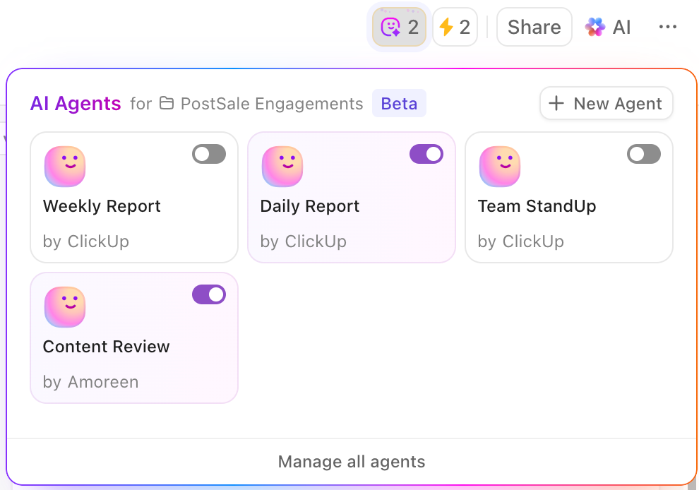 ClickUp AI Agents help eliminate this grind. Think task creation, reminders, updates, meeting notes, drafting emails, and even creating end-to-end workflows! All of that (and more) can be automated in a jiffy with ClickUp, your everything app for work.