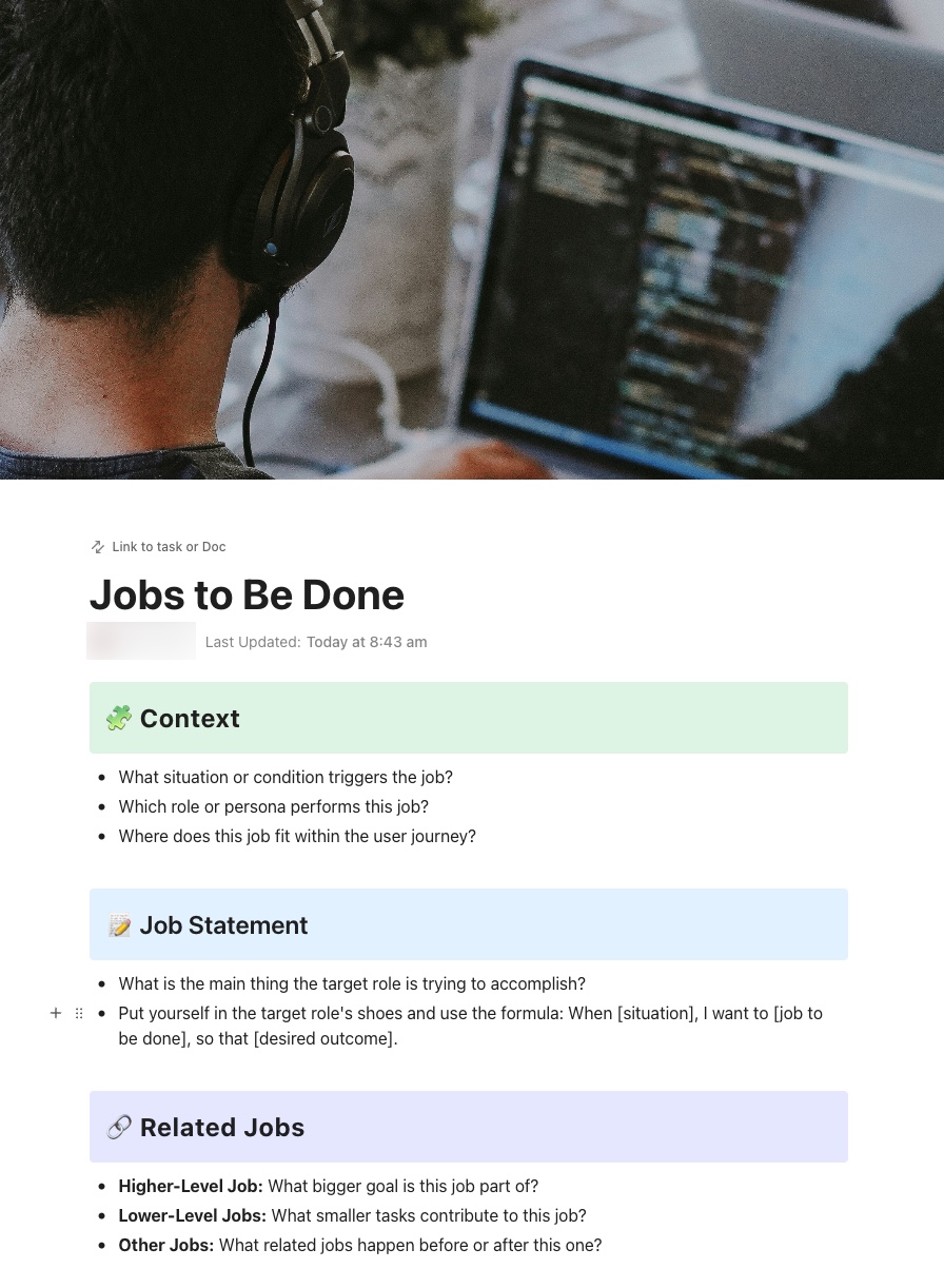 The ClickUp Jobs To Be Done Template is a valuable tool to transform your customer research into actionable tasks and goals. This unique template designed as a ClickUp Doc allows you to list out and track all the customer jobs, their pains, and the success metrics to judge your solution.
