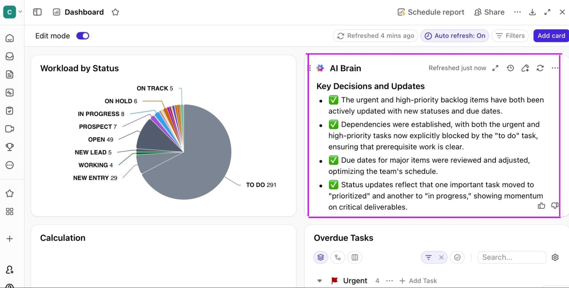 | AI capabilities | Robust with ClickUp Brain that provides contextual answers, summaries, automatic task creation, and dashboards | Integrated AI for workflow efficiency and insights |