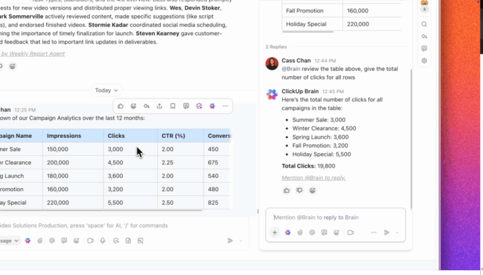 As context-aware AI, it sits in your workspace and helps you turn knowledge from your ClickUp Tasks, Docs, and Chat into actionable insights, without copying details across tools.