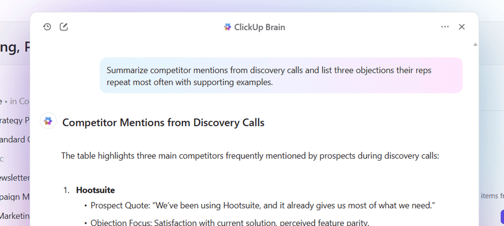 Here’s one of the key reasons why ClickUp stands out as a ChatGPT alternative: ClickUp Brain offers everything ChatGPT misses out on through dedicated personalization.