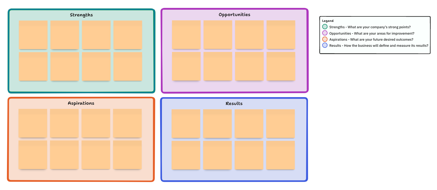 A ready-to-use whiteboard layout simplifies brainstorming, strategic planning, and team alignment, ensuring seamless decision-making and progress tracking.