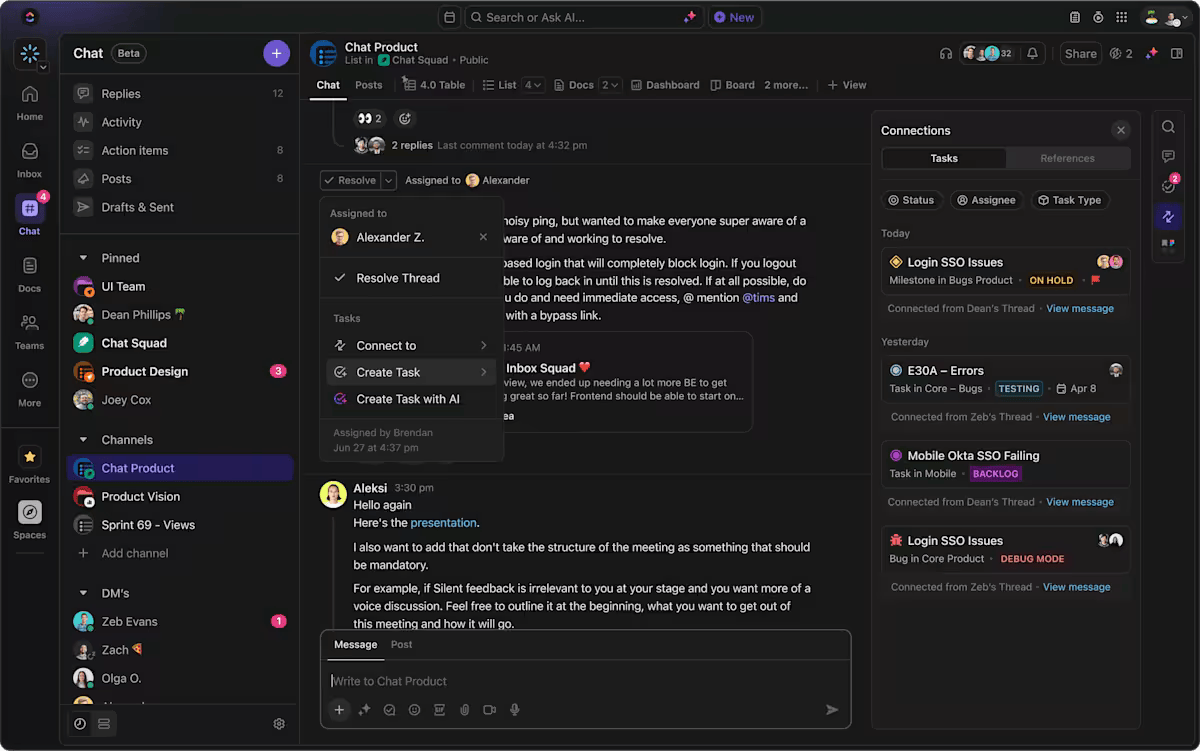 Unlike traditional messaging apps that separate discussions from action, ClickUp Chat ensures every conversation is linked to the topic that matters. Messages can instantly become tasks in one click, keeping your goal-driven group’s objectives structured.