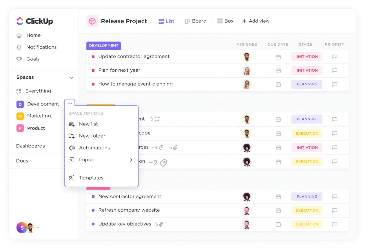 ClickUp Spaces let you build a workspace that fits your team’s unique needs, whether you’re managing projects, tracking campaigns, or organizing client work. With Custom Statuses, 15+ ClickUp Views, and granular permissions, Spaces helps you keep work structured without unnecessary clutter.