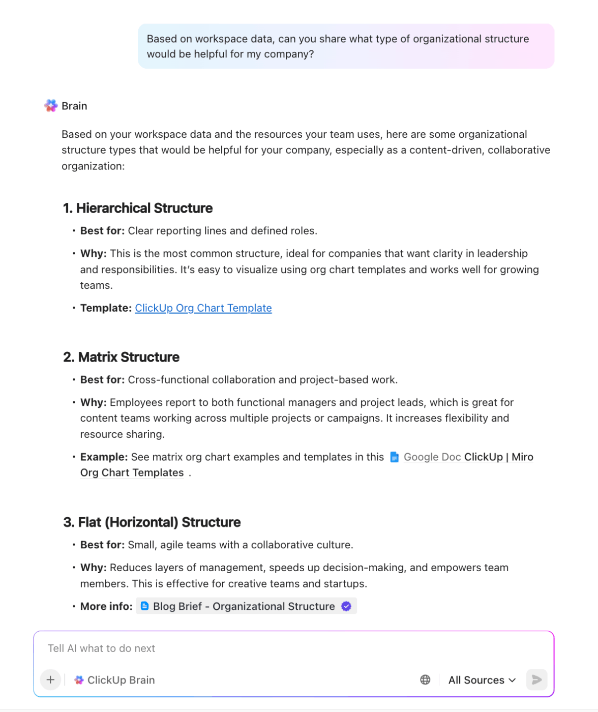 🤝 Friendly Tip: Feeling stuck because of your unique org structure? ClickUp Brain can instantly create detailed organizational charts using real workspace data, allowing you to visualize reporting lines and team roles for your company.