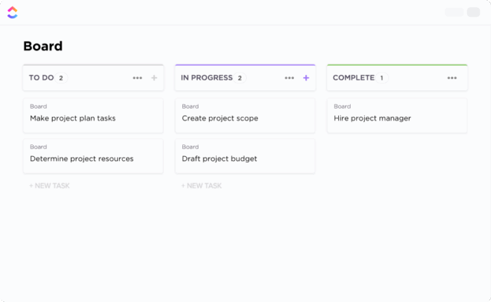 | ClickUp Board Template | Get free template | Project teams, department heads | Customizable columns, visual task tracking, drag-and-drop | ClickUp Board, List |