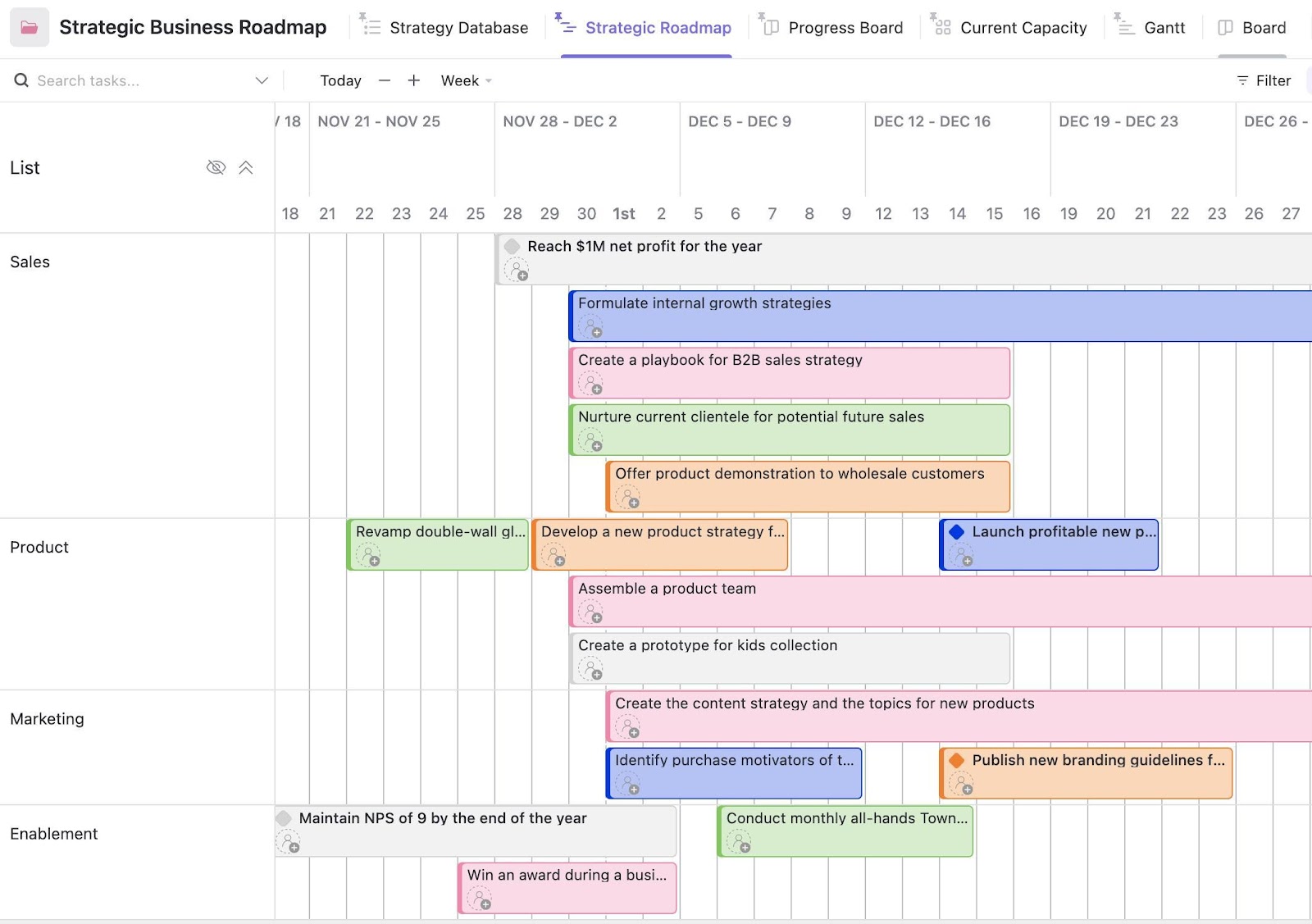 The Business Roadmap Template by ClickUp is perfect for visualizing your business strategy and outlining key goals and the steps to achieve them.