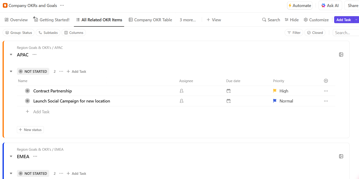 ClickUp’s Company OKRs and Goals Template offers a structured framework for setting, tracking, and achieving your objectives. It breaks tasks into actionable steps, assigns responsibilities, and monitors progress in one centralized hub.