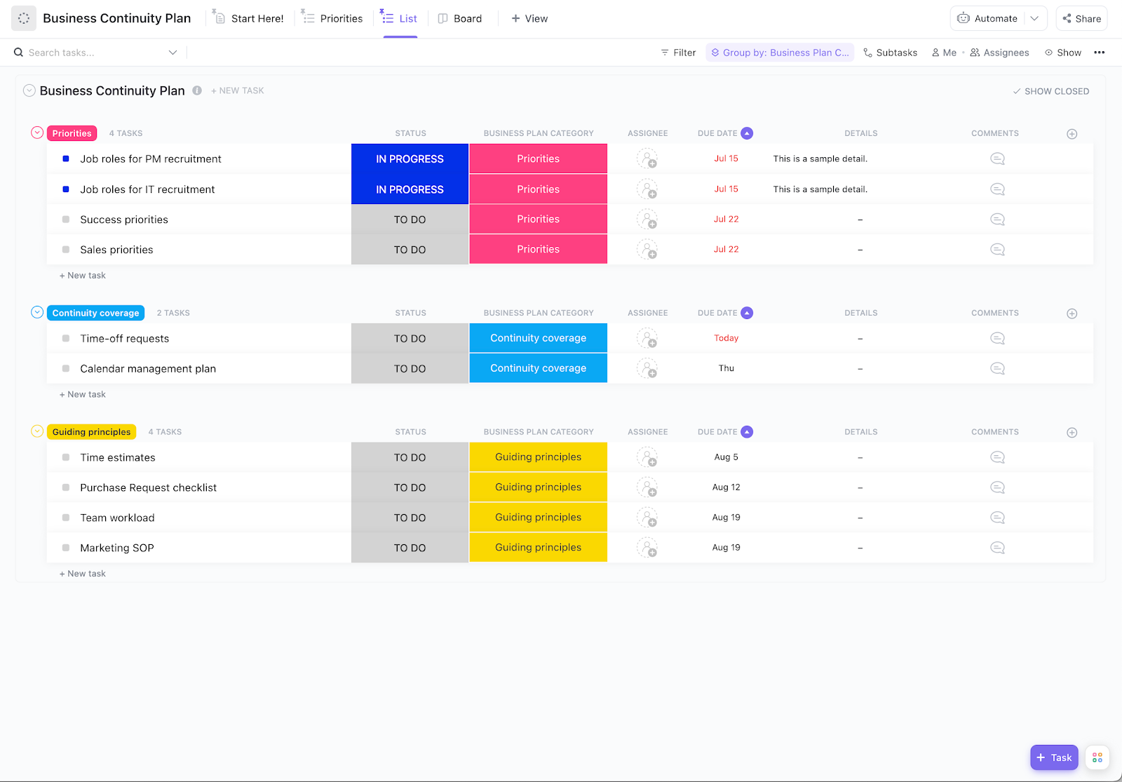 When the unexpected hits, like a data breach or supply chain mess, you don’t want to look for answers. You want a plan. And ClickUp’s Business Continuity Plan Template helps you develop that plan!